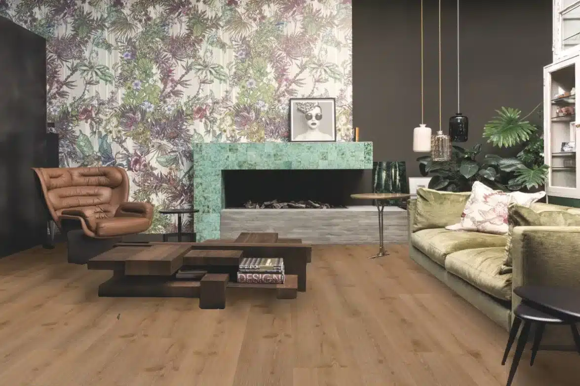 El suelo de clic Akkelis de Kährs Luxury Tiles presenta ricos tonos marrones y sutiles matices dorados y ámbar. Akkelis es un suelo de diseño de madera con carácter y una cálida impresión. Las vetas, nudos y grietas rústicas de la madera se realzan con un relieve sincronizado para lograr una auténtica apariencia de madera.