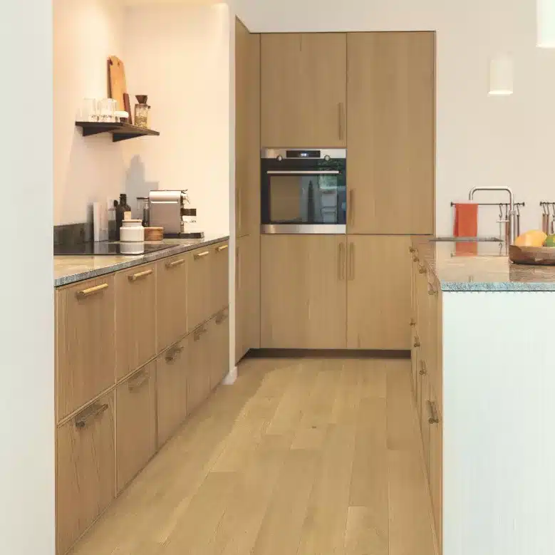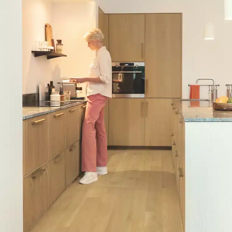 La colección de tarima flotante Amato de Quick Step es acogedora, única e impermeable. Estos suelos de madera resistentes al agua son un sueño para caminar, ya que combinan sin esfuerzo la durabilidad con la belleza natural. Exactamente el tipo de sofisticación que merece tu hogar y adecuado para cualquier habitación, incluidas cocinas y baños.