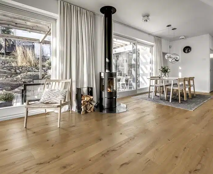 El suelo de clic Moesgaard de Kährs Luxury Tiles presenta un diseño de roble natural claro, suavizado por un tinte blanco transparente, lo que resulta en un suelo atemporal que complementa cualquier interior. El color roble natural, la veta de la madera y los nudos y grietas visibles crean una apariencia auténtica, realzada por el relieve sincronizado.