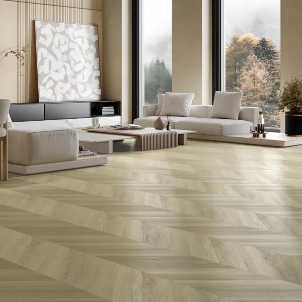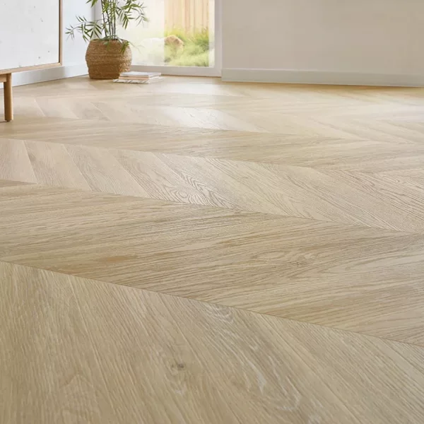 Con su elegante diseño de espina francesa y el sutil acabado blanqueado, este suelo transforma por completo la atmósfera de tu hogar.