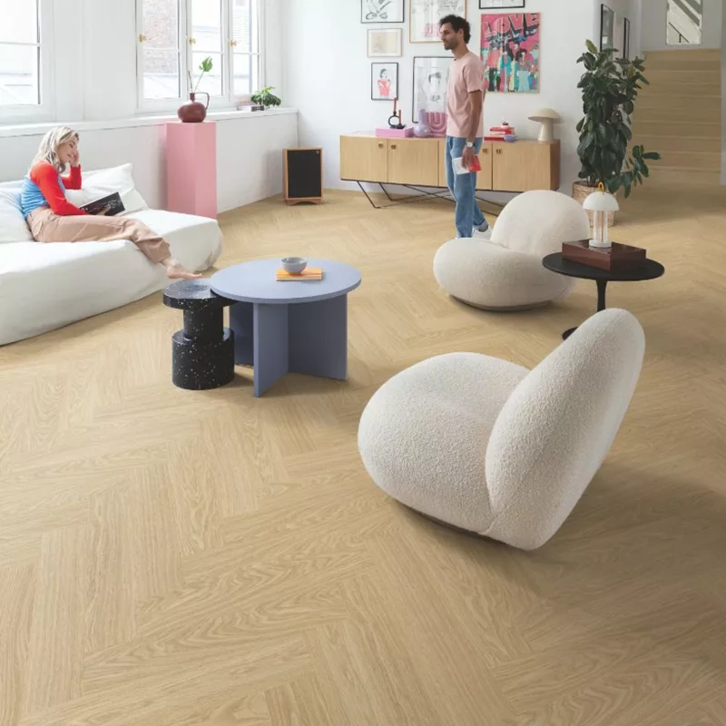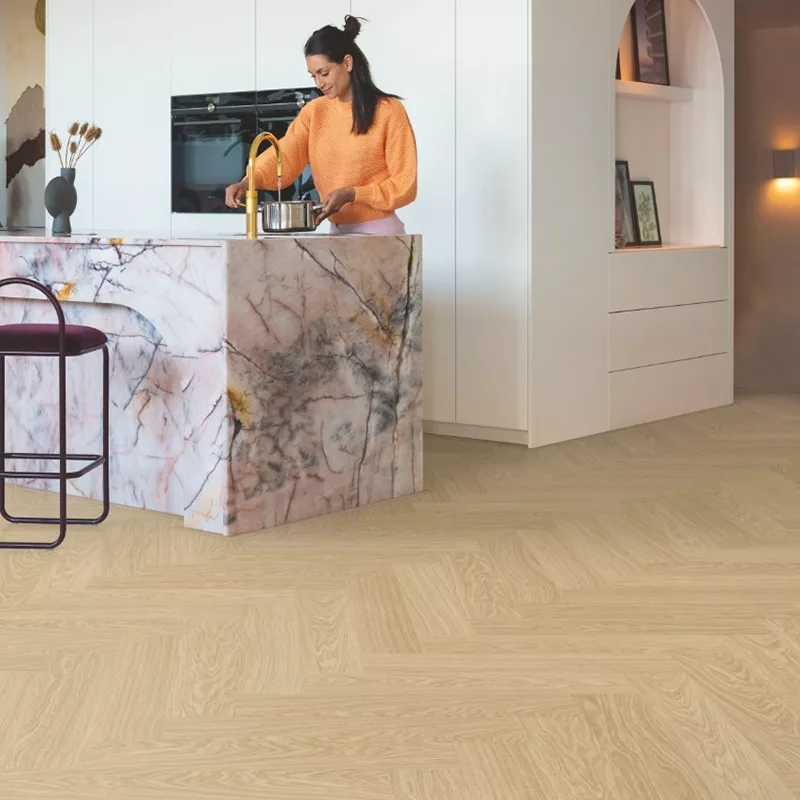 Suelos de vinilo rígidos de alto rendimiento con clic estanco avanzado Unizip para instalación en espiga gracias a su formato de plancha corta de 1 listón.