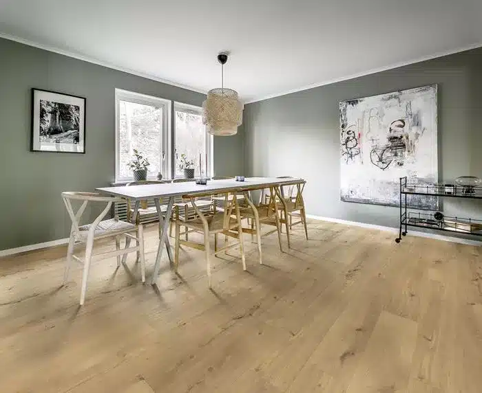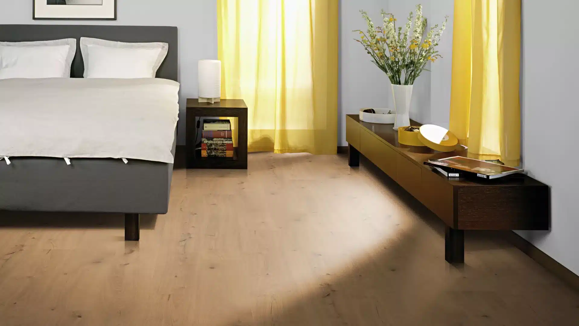 El suelo clic Thuringian de Kährs Luxury Tiles presenta un diseño de roble natural claro, suavizado por un tinte blanco transparente, lo que resulta en un suelo atemporal que complementa cualquier interior. El color roble natural, la veta de la madera y los nudos y grietas visibles crean una apariencia auténtica, realzada por el relieve sincronizado.